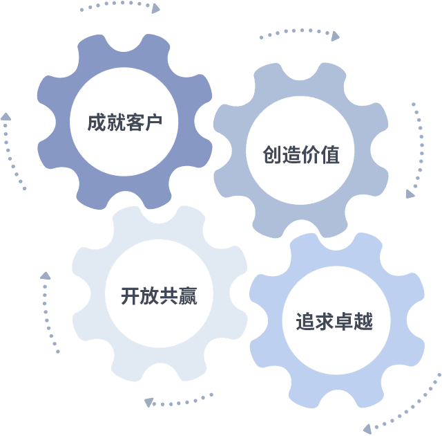 成就客户是一切决策的出发点,,,创造价值是衡量所有工作的标准,,,,追求卓越是我们做事做人的态度,,,开放共赢是我们的格局也是最终的结果。。价值观的齿轮环环相扣,,,推动着组织里的每个人不断向前。。
